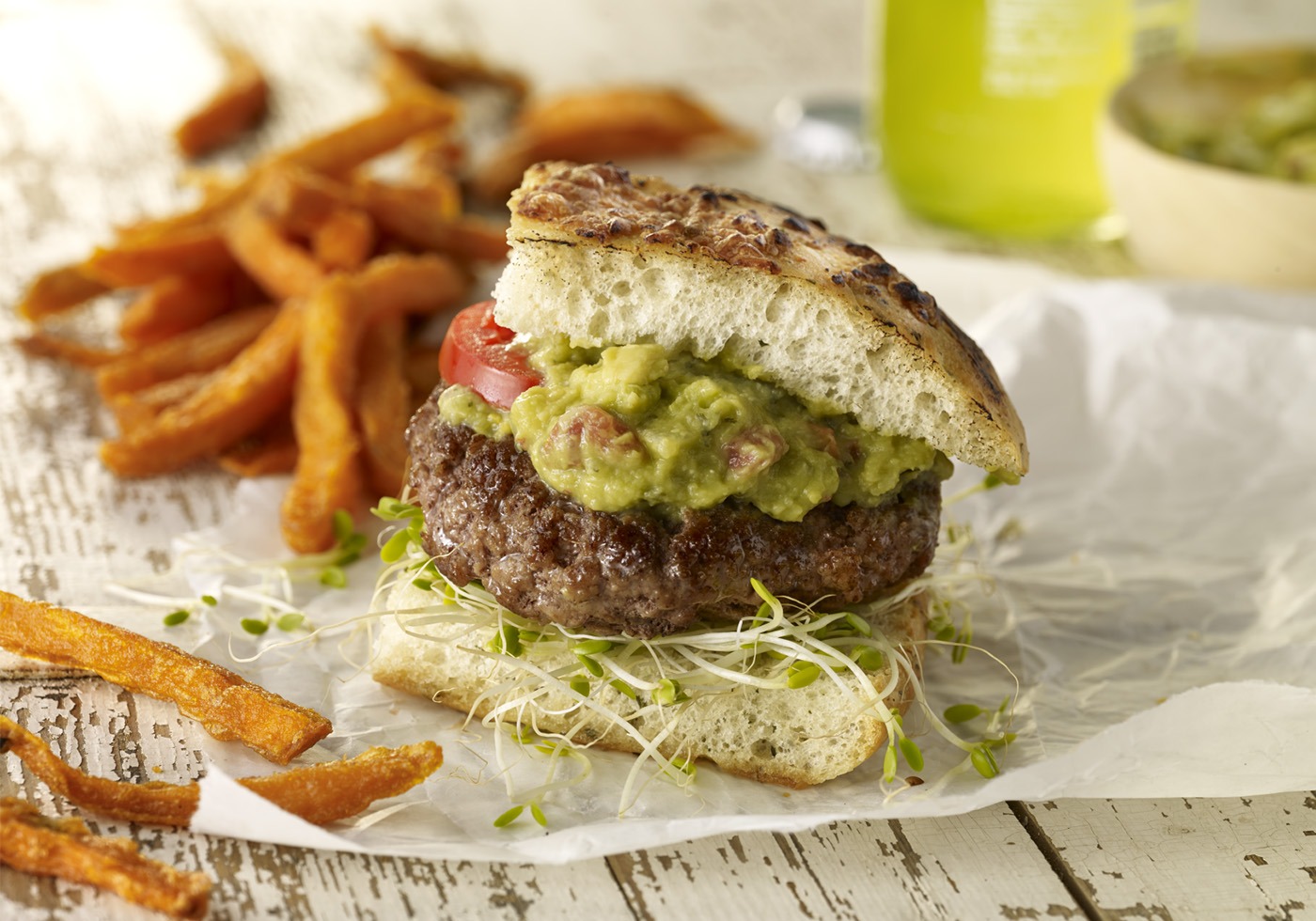 Lean ground beef gets a kick from WHOLLY® GUACAMOLE Jalapeño Garlic Guacamole, served on focaccia with sprouts and a side of sweet potato fries.